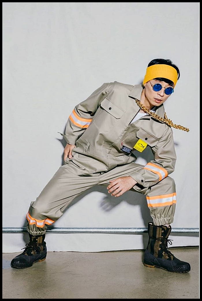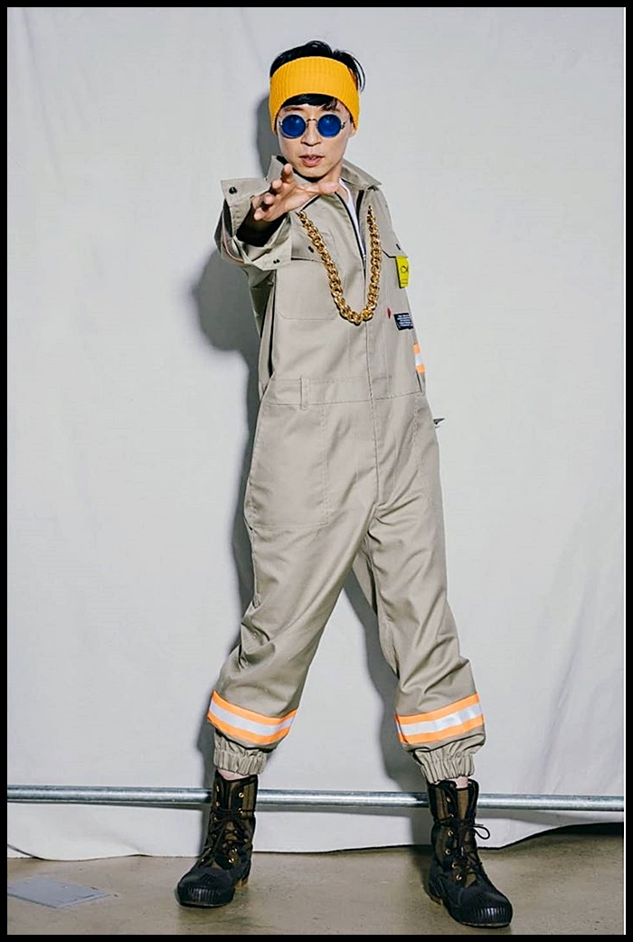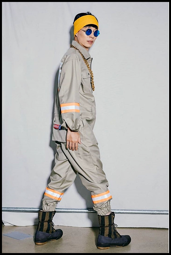 유재석은 일명 츠나기라고도 불리는 점프슈트에 워커를 착용했습니다. 점프슈트는 국내 브랜드 홀리 넘버 세븐의 제품입니다.