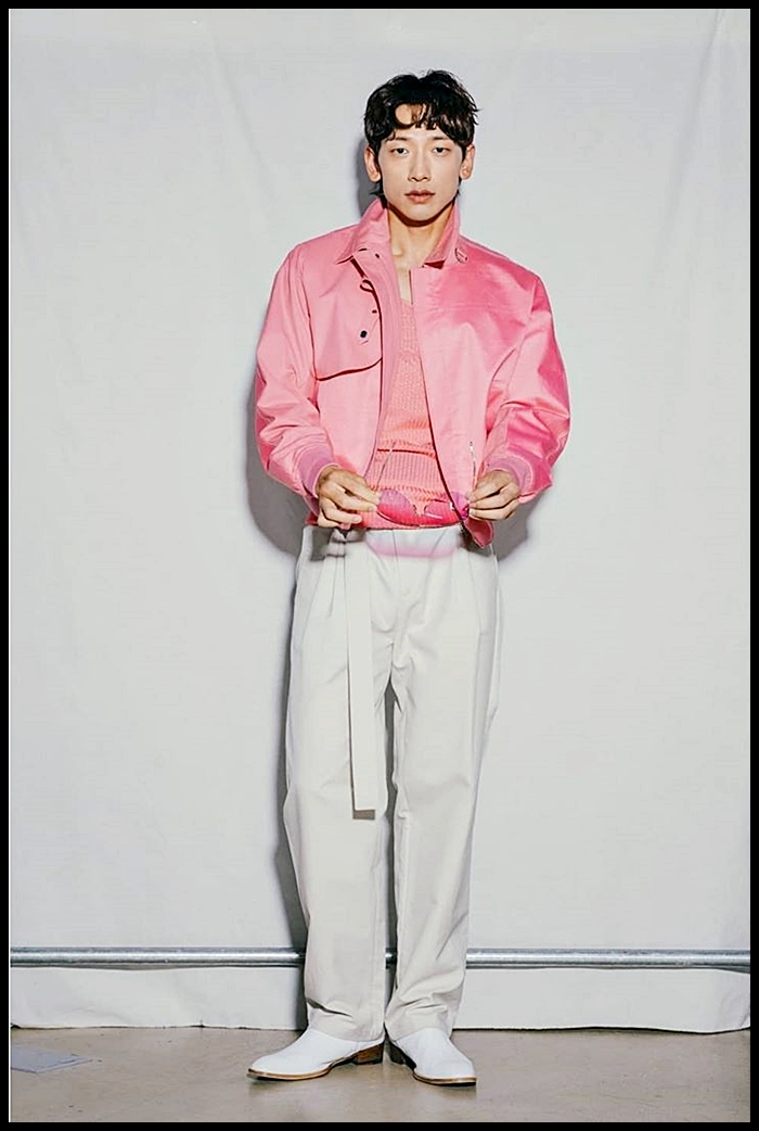 비는 디올 멘의 2020 봄, 여름 런웨이 착장 중 하나를 활용한 코디를 선보였습니다. 핑크색 재킷과 미색의 벨트 그리고 팬츠 모두 디올 옴므의 제품입니다.