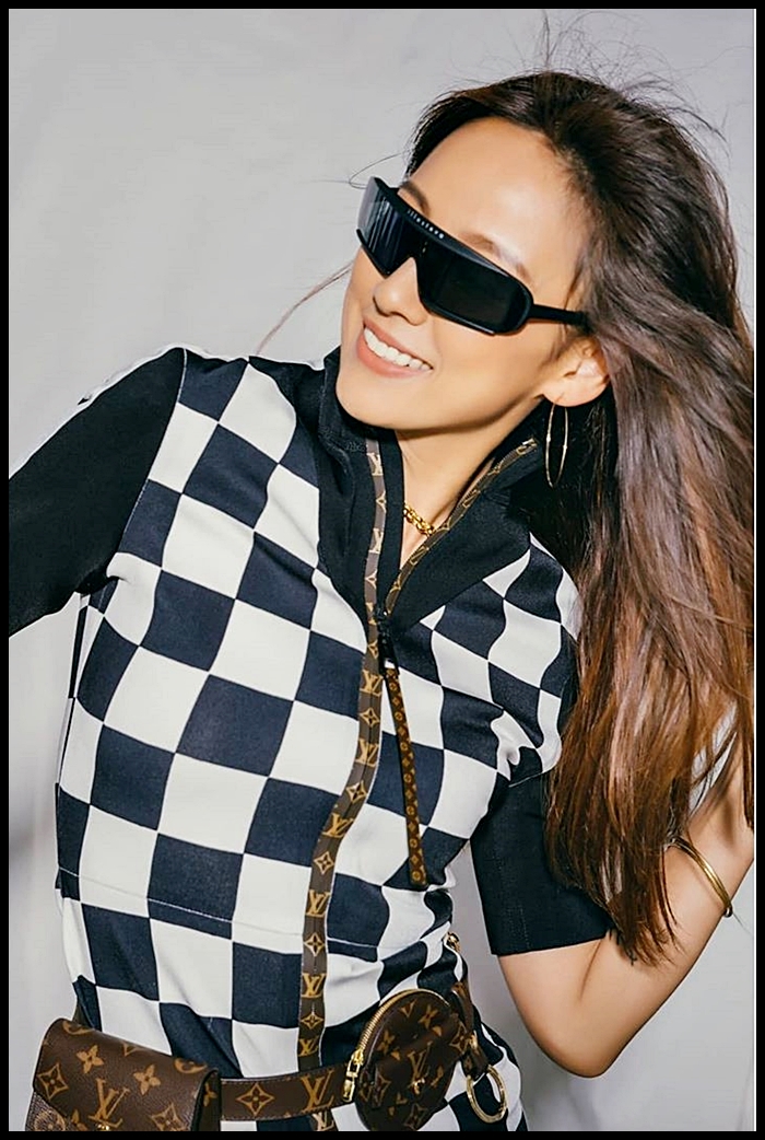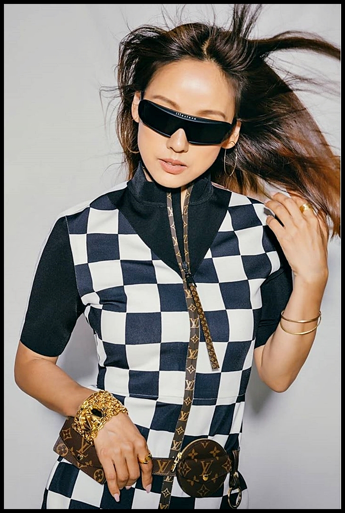 상의는 루이 비통의 제품입니다. 하이 넥 스타일이라 여러가지 연출이 가능하며 루이 비통의 다미에 패턴이 큼직하게 프린트되어 있는 것이 특징입니다.