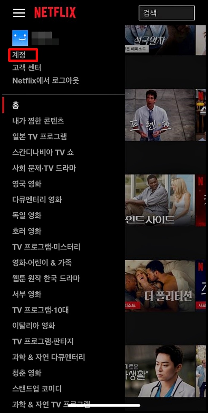 1. 우선 넷플릭스 (netlfix.com)에 들어가 로그인을 해줍니다. 오른쪽 상단의 아이콘을 클릭하면 스크롤 메뉴가 나오는데요, 계정에 들어갑니다.