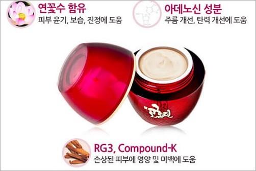 카이스트 생명화학공학과의 허율 박사님께서 특허를 내신 'RG-3, Compound-K'의 미세 입자를 18년 간 연구개발 후 화장품 성분이 피부 진피층까지 흡수될 수 있도록 만들어졌고 결과적으로 사용자의 피부를 탄력 있고 화사하게 만들어 준다고 합니다. 더 상세히 설명하자면 RG-3 성분이 피부 면역력 생성과 주름 방지 효과를 가져다주며, Compound-K 성분은 비타민C 40배 정도의 미백 효과와 기미 및 잡티를 개선해줍니다.