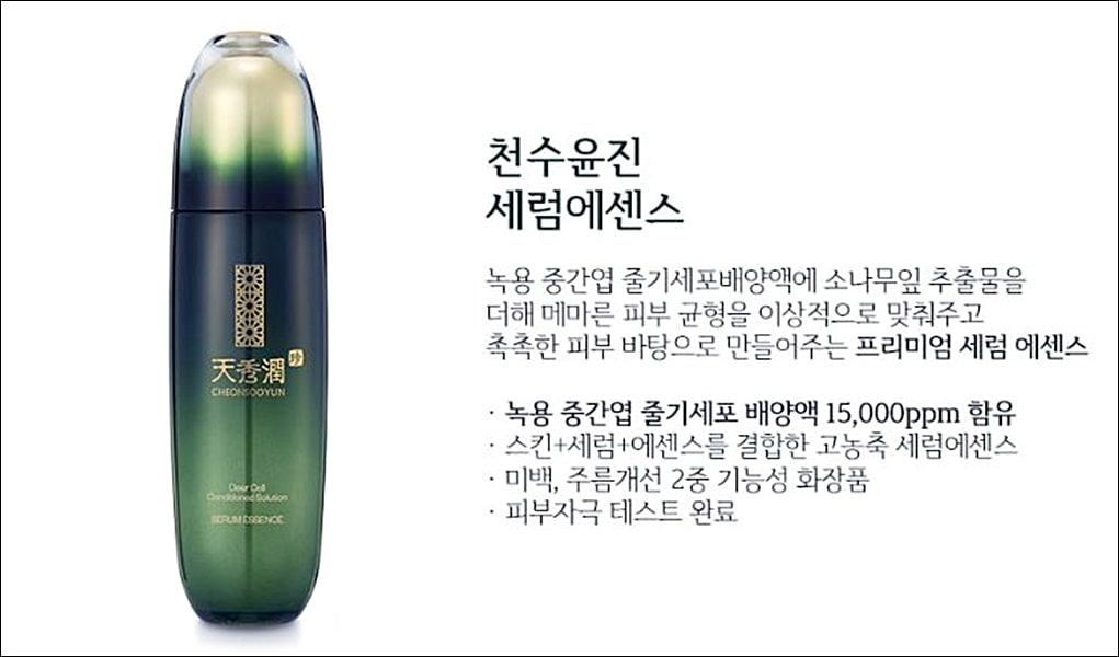 천수윤진 세럼에센스: 녹용 중간엽 줄기세포 배양액이 15,000ppm 함유되어 있으며 피부 밸런스를 이상적으로 맞춰줍니다. 또한 소나무잎 추출물이 더해져 피부를 더욱 촉촉하게 가꿔줍니다.