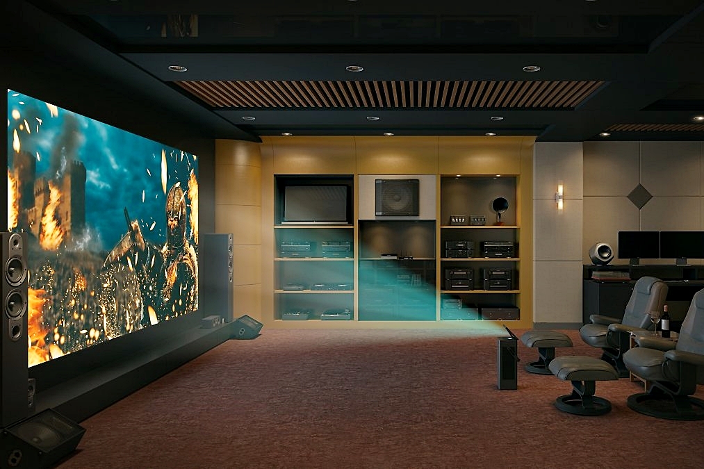화면이 완전히 내려가 있는 제로 뷰 (tv를 안 볼 시 사용). 제로 뷰는 인테리어 목적의 사용 방식입니다. 디스플레이를 완전히 숨겨 오브제로서의 기능을 하며 4.2 채널에 100와트 출력을 내는 블루투스 스피커로도 활용이 가능합니다.