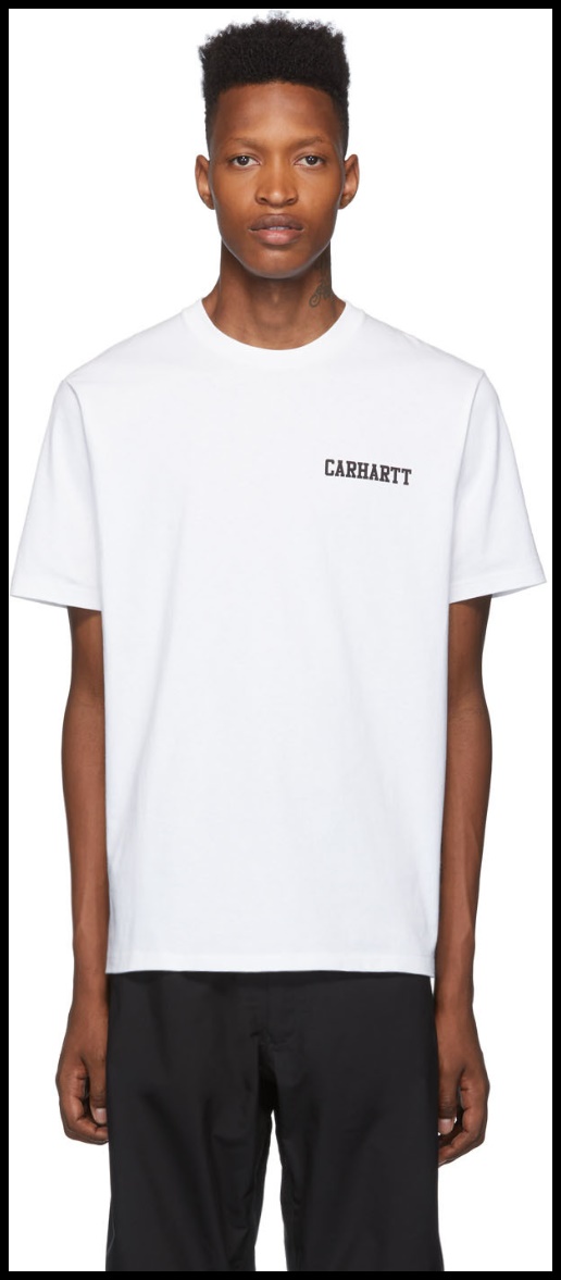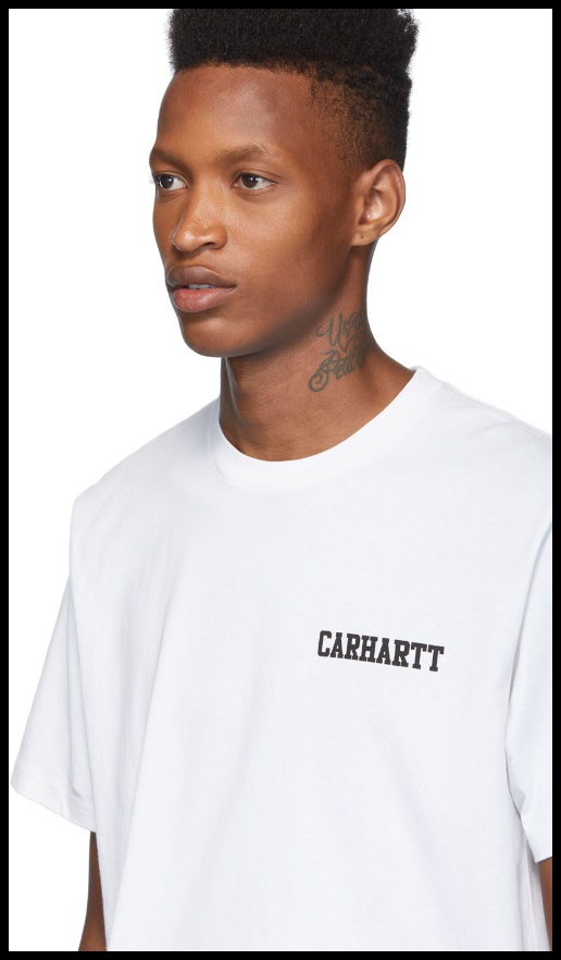 칼하트의 스트리트 패션 라벨 칼하트 WIP에서 나온 화이트 콜리지 스크립트 티셔츠. 깔끔한 폰트로 포인트를 준 것이 특징이며, 적당한 넥라인과 핏으로 데일리웨어에 적합합니다.