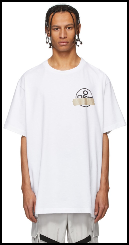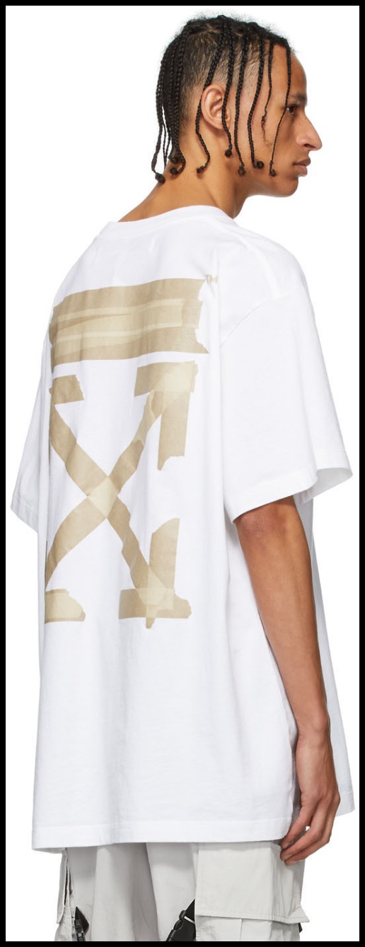 오프 화이트의 큼지막한 화살표 로고가 마스킹 테이프로 표현됐습니다. 사진에서 보시다시피 엄청난 오버 사이즈이니 스트리트한 무드로 스타일링하면 딱일 거 같습니다.