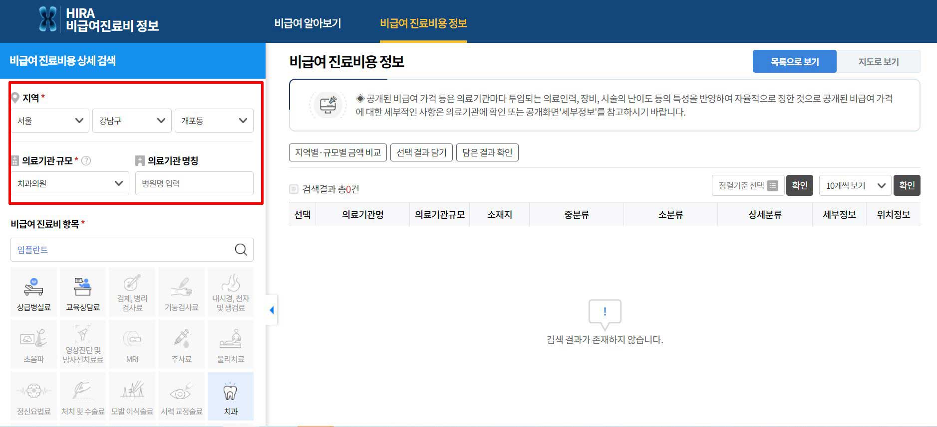 비급여 정보란에서 임플란트를 입력한 뒤 상세분야에서 세라믹, 금, PFM, PFG, 올세라믹 등 전체 항목 또는 일부 항목을 선택합니다.