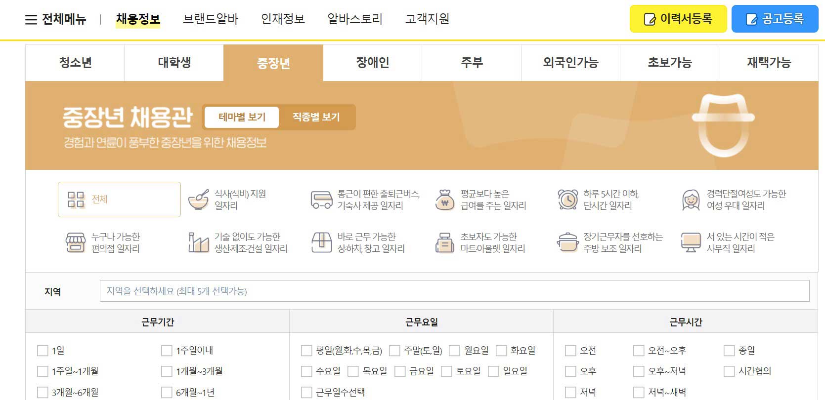 경험과 연륜이 풍부한 중장년을 위한 채용정보를 보여주는 알바천국의 중장년 채용관 또한 좋은 사이트입니다.