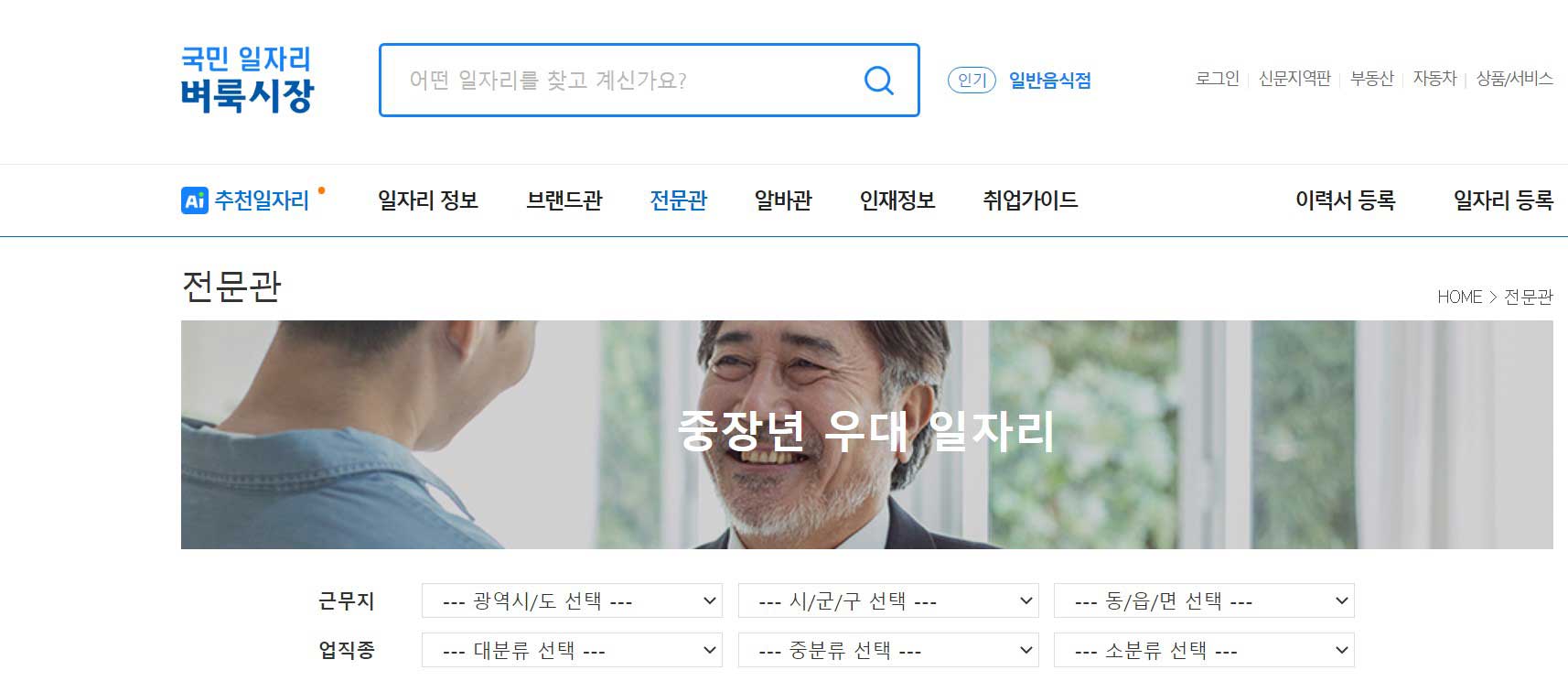 다음으로 소개해드릴 곳은 국민 일자리를 제공하는 벼룩시장의 중장년 우대 일자리 전문관입니다.