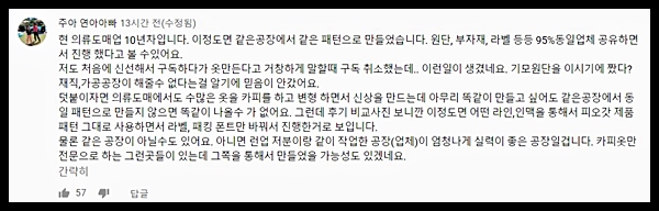 해당 논란을 본 일부 패션업 관련 종사자들 또한 카피를 의심하고 있는 실정입니다. 한 구독자가 남긴 코멘트를 같이 살펴보겠습니다. 뿐만 아니라 원단을 직접 짰다는 것부터 말이 안 된다라고 말하는 구독자들 또한 존재하는데요, 초도 물량이 적은 만큼 원단 직접 발주 또한 거짓말이 아니냐는 의혹도 제기되고 있습니다.