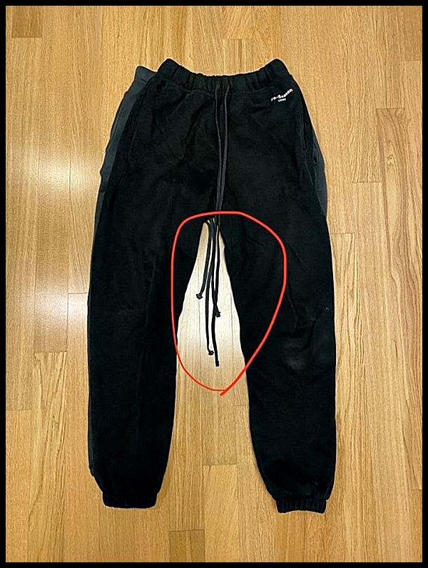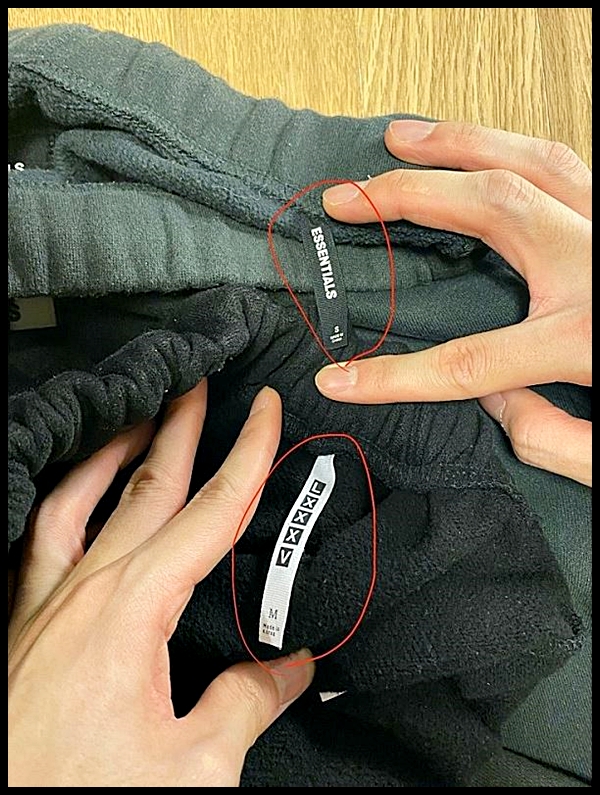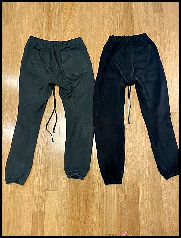 게시자 설명에 따르면, LXXXV의 제품은 피어 오브 갓 에센셜 제품과 똑같은 패턴과 디테일을 보여줍니다. 특히 바지 핏을 가르는 중요한 가랑이 쪽 패치가 완전히 일치합니다. 뿐만 아니라 뒷포켓 사이즈와 라벨의 위치 그리고 스트링 마감처리까지 유사한 모습입니다.