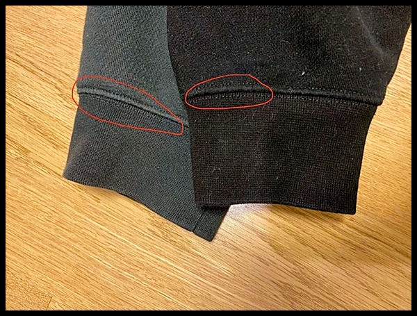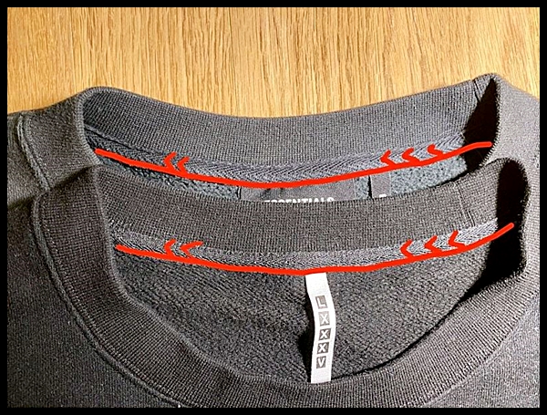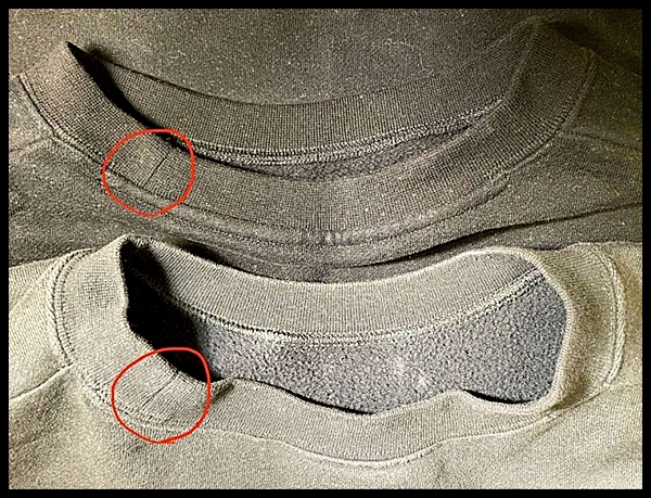 넥라인의 봉제 위치가 정확하게 일치합니다. 사실 봉제 위치만 놓고 보더라도 오차가 존재하는데 이 경우 그런 모습이 보이지 않아 완벽히 일치한 패턴을 썼다고 밖에 생각이 안 드는 디자인입니다. 상의 역시 피어 오브 갓 제품과 똑같은 라벨 위치 그리고 봉제 방식을 택했습니다.